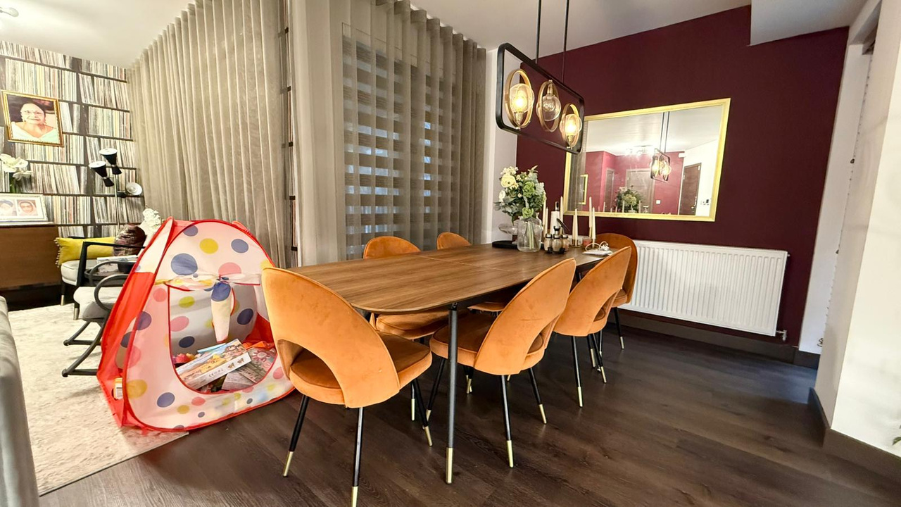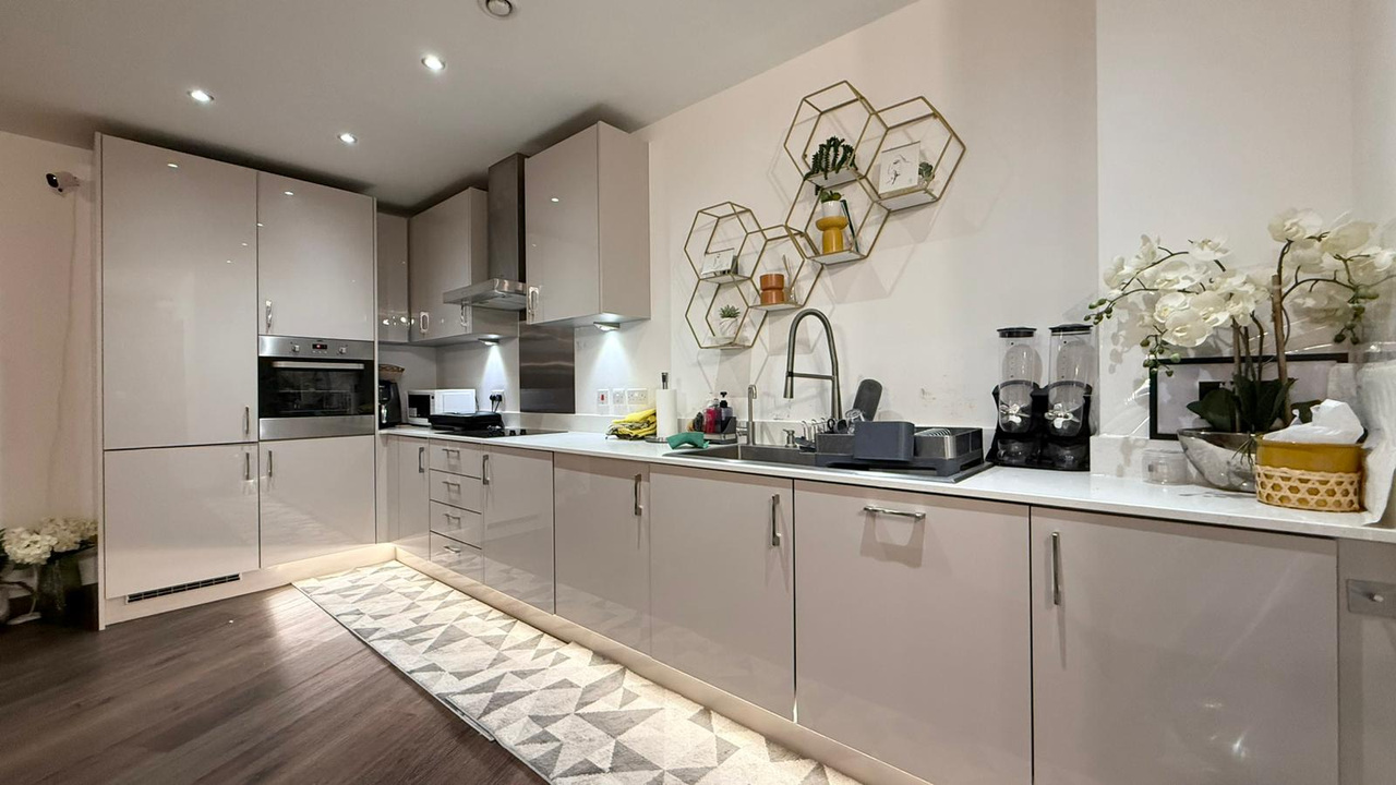 The spacious open-plan living area is flooded with natural light and styled to perfection, seamlessly blending luxury with comfort. The sleek, fully fitted kitchen boasts state-of-the-art appliances, premium cabinetry, and elegant worktops – ideal for both everyday living and entertaining.