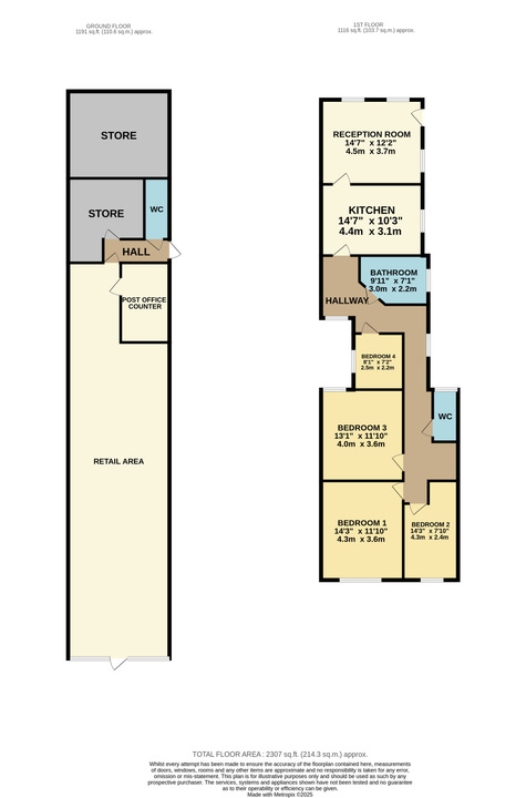 Above, the self-contained 4-bedroom residential flat measures around 1,116 sq. ft. and benefits from its own private entrance, allowing it to be let separately or used as owner accommodation.